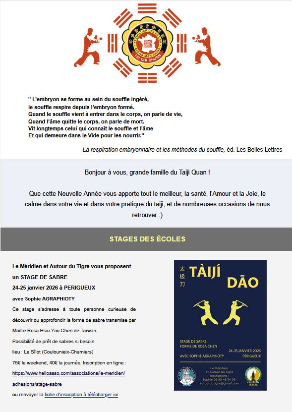 Après quelques années d’absence, nos rencontres annuelles de poussée des mains ont enfin pu reprendre ! Les 9 et 10 Novembre 2024, des membres des écoles de notre fédération, ainsi que des pratiquants d’autres styles se sont retrouvés au Dojo départemental de Périgueux pour partager un week-end de Tui Shou animé par les maîtres William…